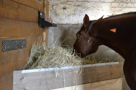 Deux rations de grains sont servies matin et soir. Le foin est à volonté ou rationné en fonction de l'état corporel.